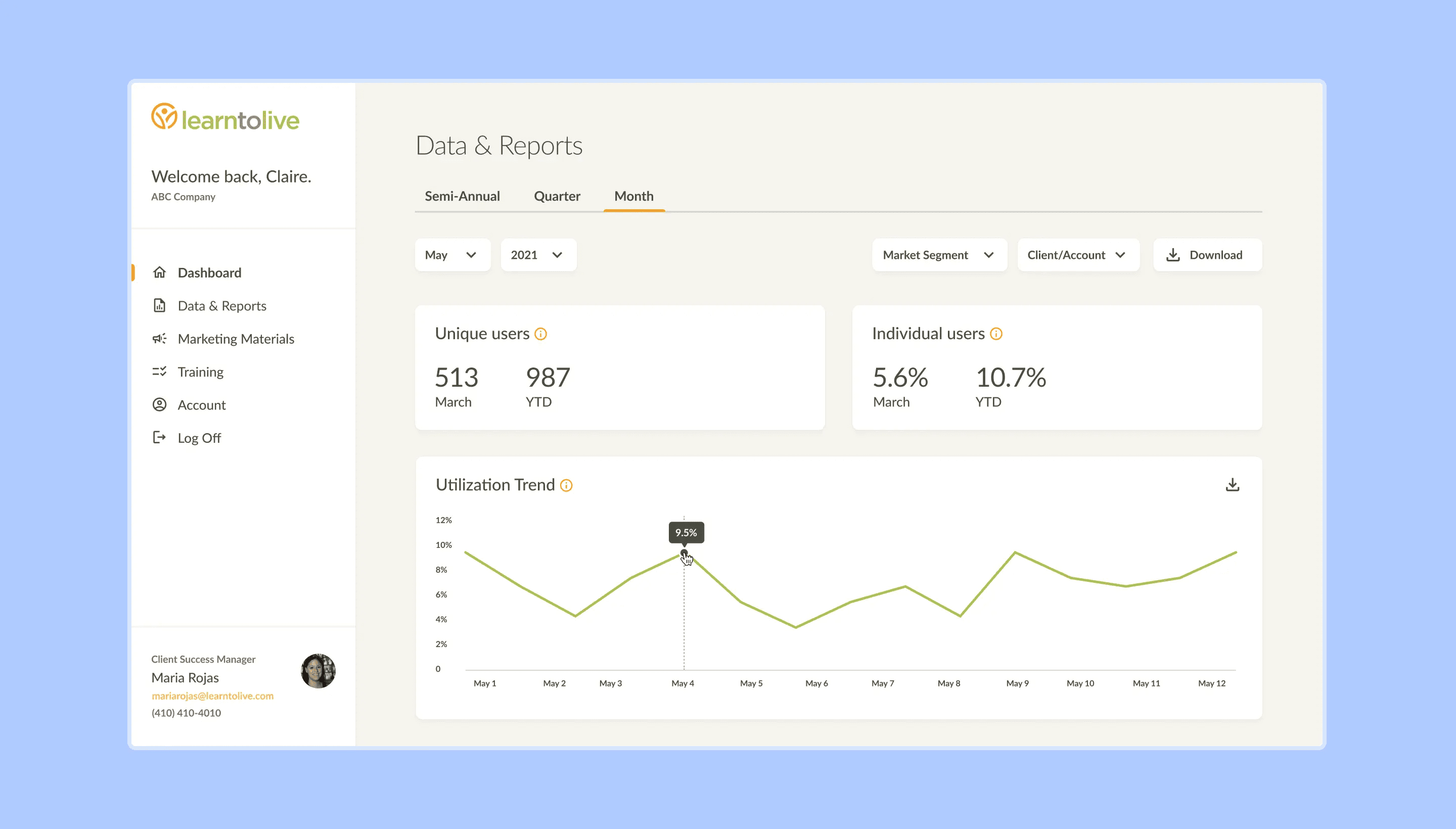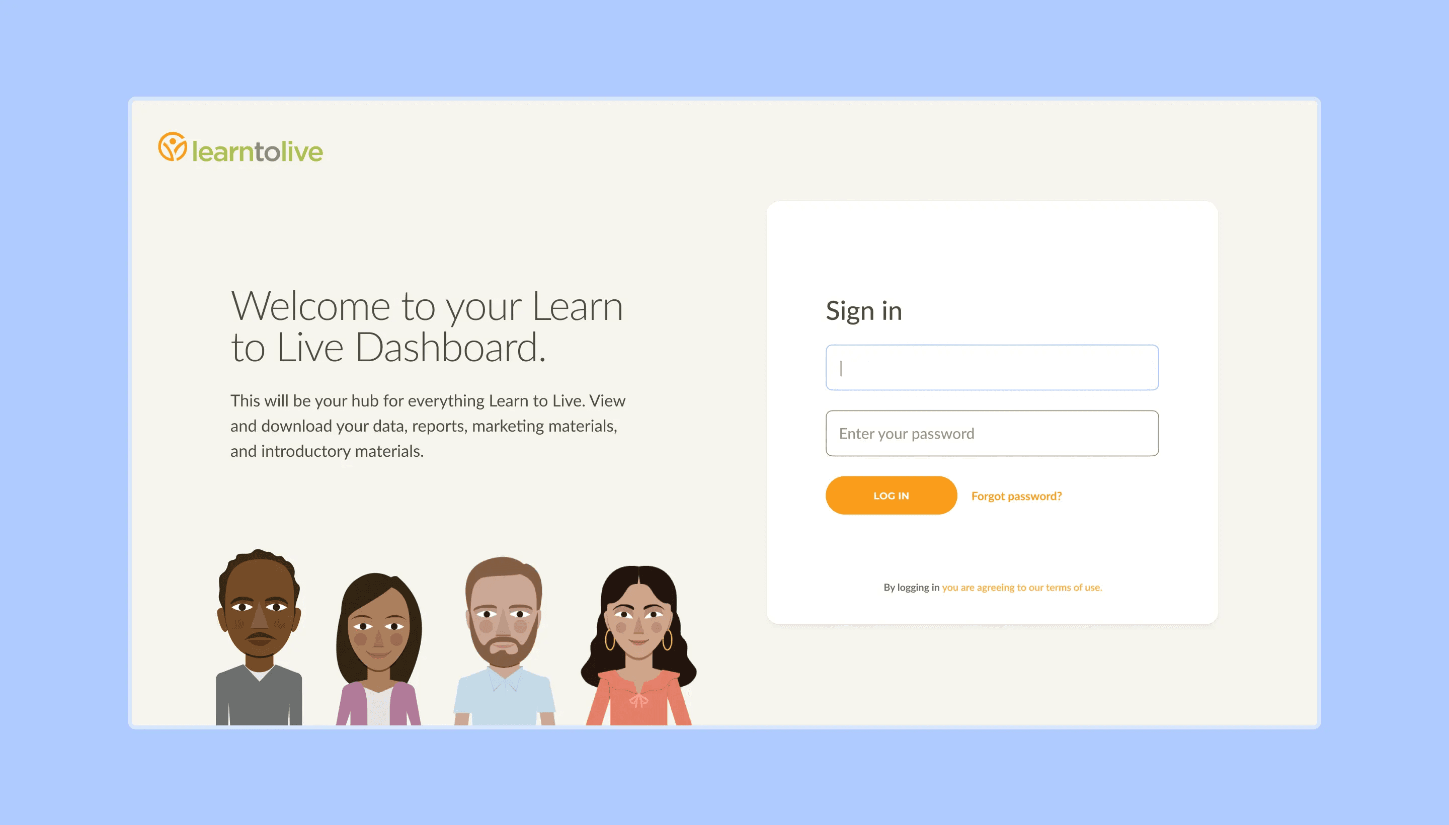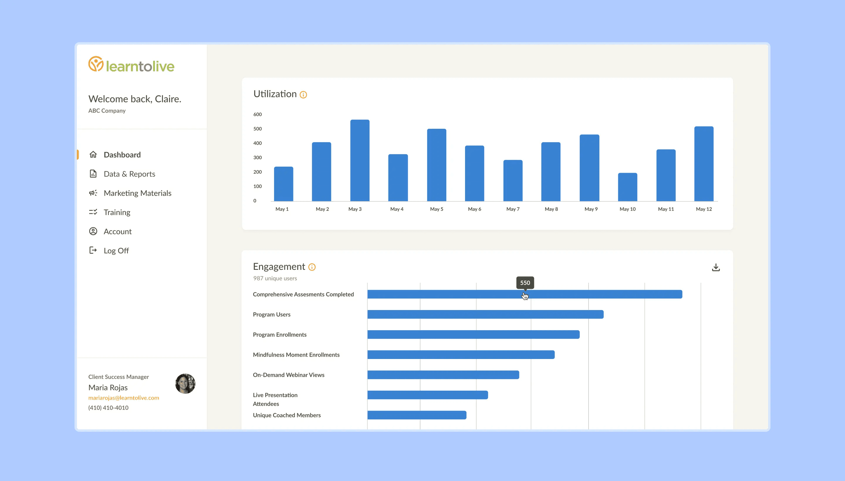 Learn to Live came to us to help them define their experience for their new client portal. Using their brand standards, we worked with their Customer Experience team to bring their vision to life based on their requirements for data and analytics.