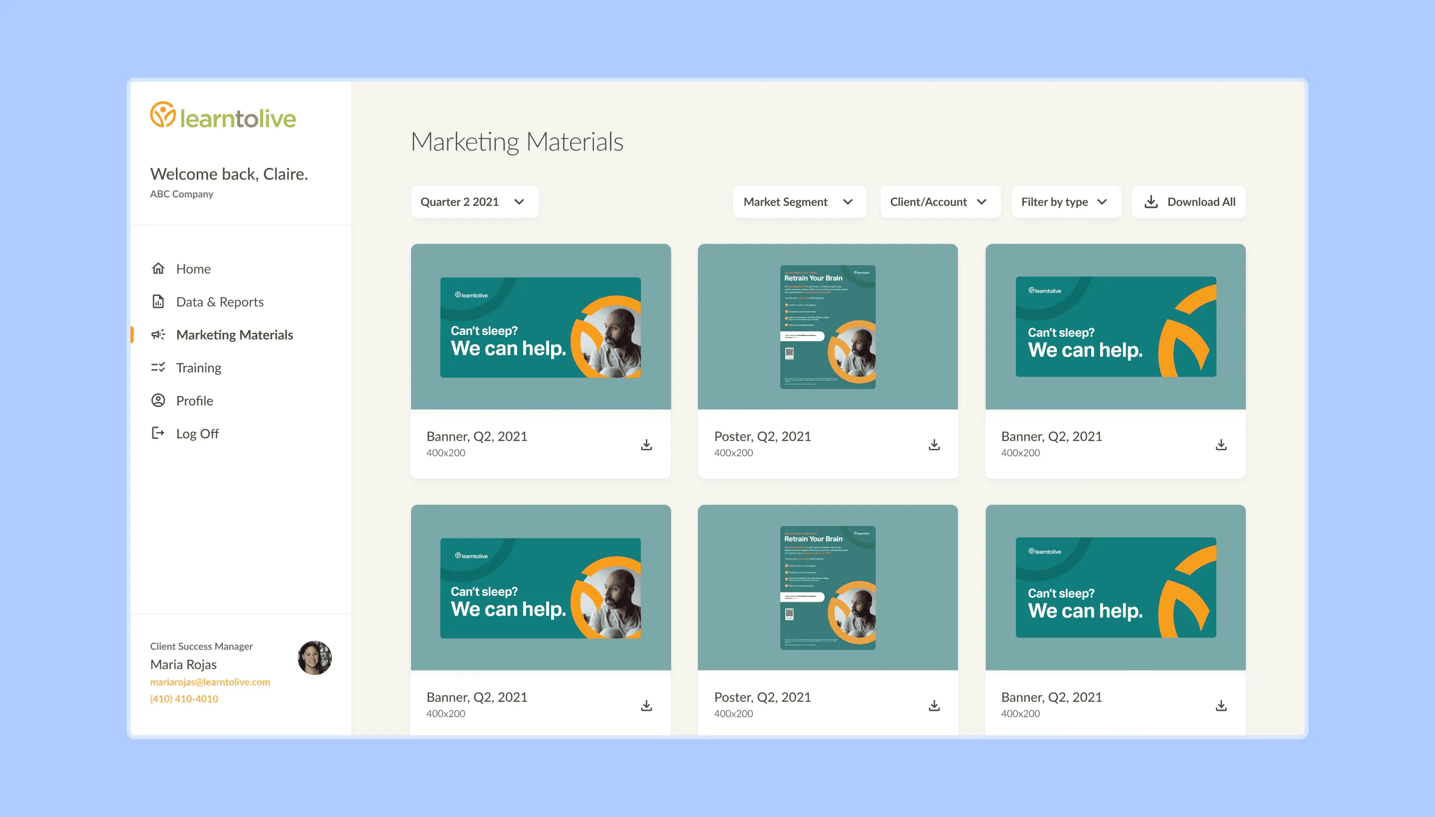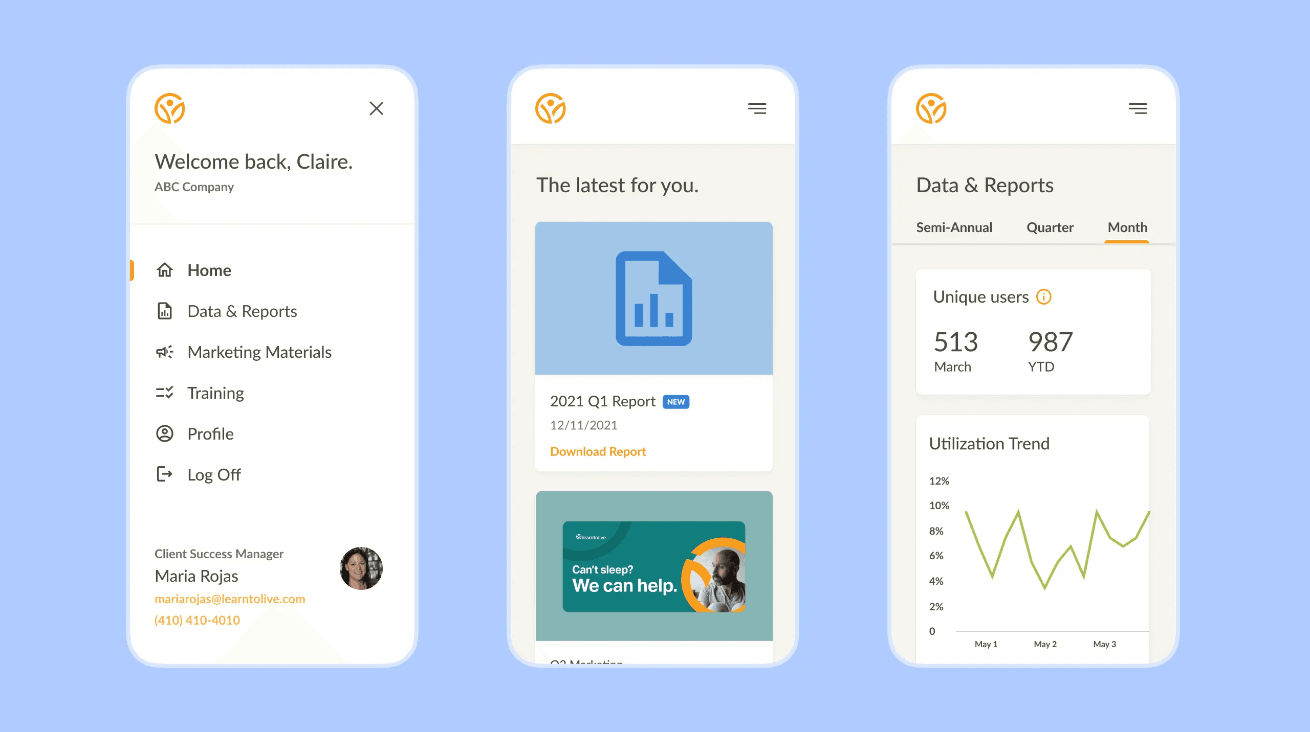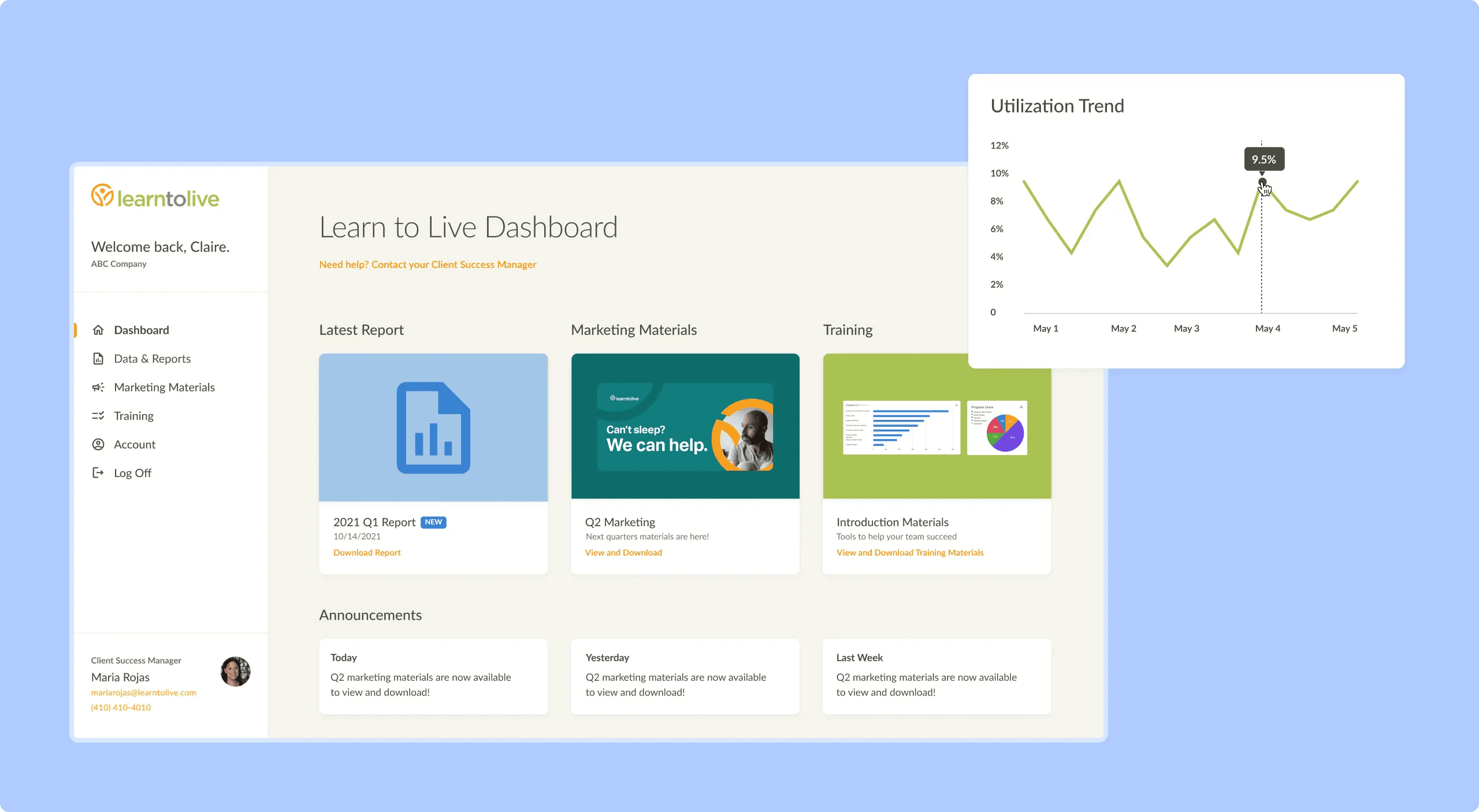 Learn to Live came to us to help them define their experience for their new client portal. Using their brand standards, we worked with their Customer Experience team to bring their vision to life based on their requirements for data and analytics.